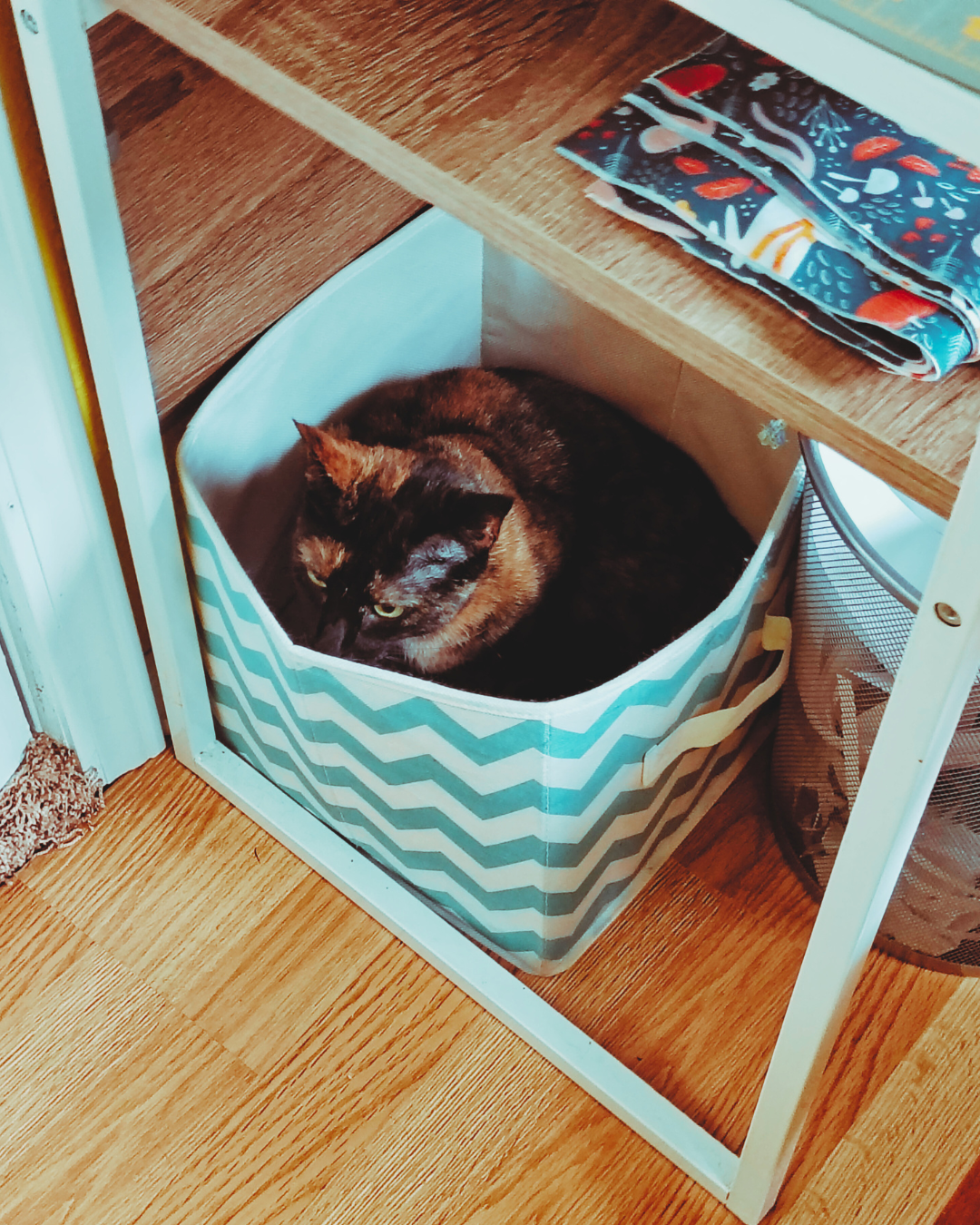 The cats absolutely love this space too. Artemis unfortunately likes to mess with plants, so I can't leave her alone in the room, but she likes to sit on the ironing board or curl up in the mending box. Penelope will claim any flat fabric following the cat rule of 'if I fits, I sits.' Jimi usually just lays out on the floor. Apollo (not a cat but very similar) likes to lay underneath my chair and Ajax actually doesn't like this room because its too small for him so he lays just on the other side of the door keeping guard.